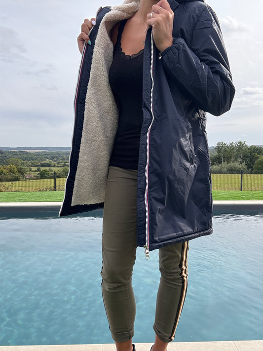 New Lolo - Manteau long bleu marine réversible imperméable fourré fausse fourrure - Curvy