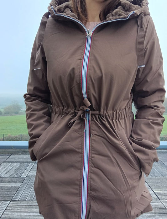 New Lolo - Manteau long MARRON réversible, imperméable et complètement fourré resserrable à la taille