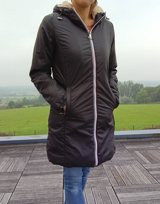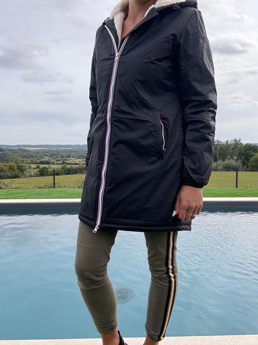 Melya Melody - Manteau long (mi cuisses) fourré imperméable noir intérieur fourrure beige