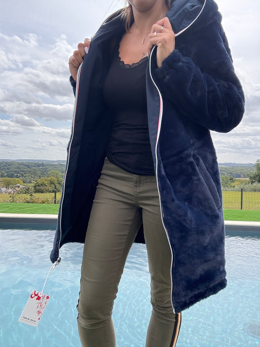 New Lolo - Manteau long bleu marine réversible imperméable fourré fausse fourrure
