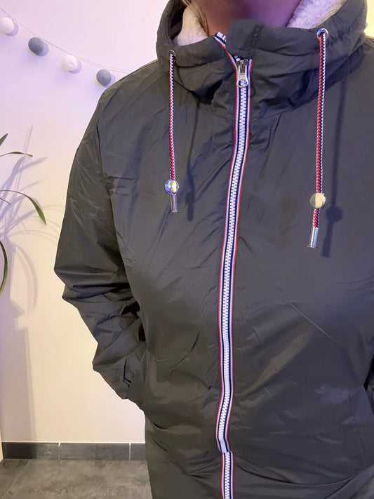 Laura Jo - Imperméable fourré long fausse fourrure kaki intérieur sherpa beige - Curvy