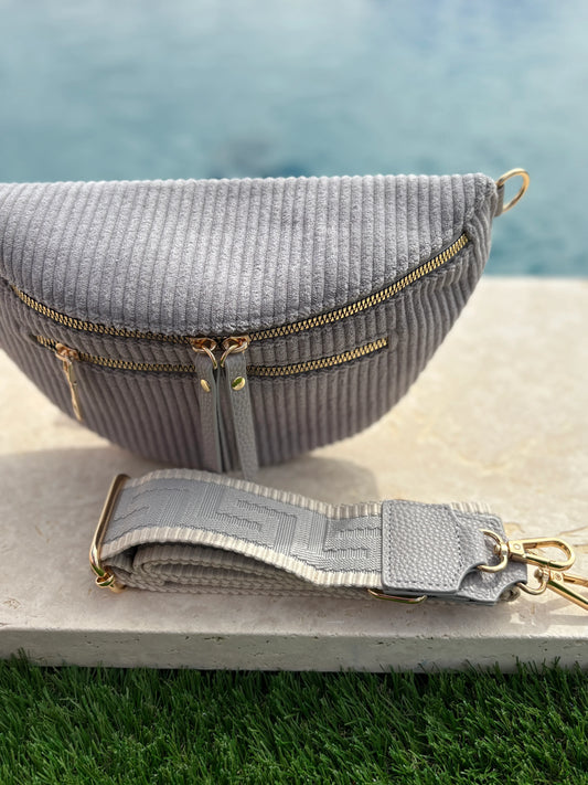 Sac banane velours côtelé 2 poches gris sangle fantaisie