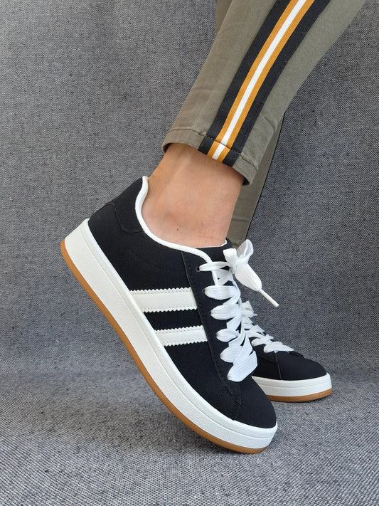Chaussures baskets basses noires à rayures blanches style sneakers campus