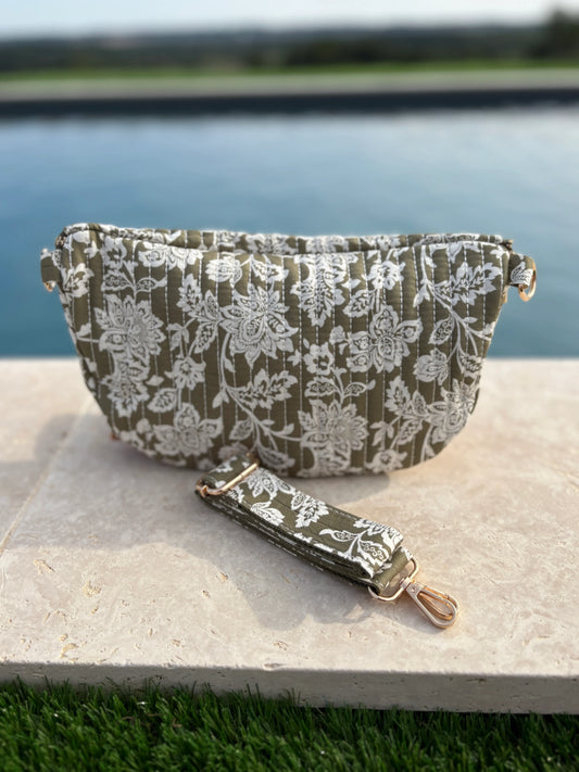 Sac banane coton matelassé liberty toile de jouy fleuri vert kaki et blanc