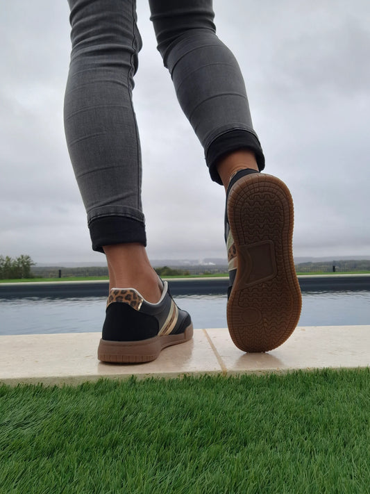 Chaussures baskets basses style sneakers campus noir avec bandes léopard et doré