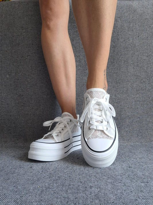 Chaussures baskets basses compensées dentelle fine blanche style converse