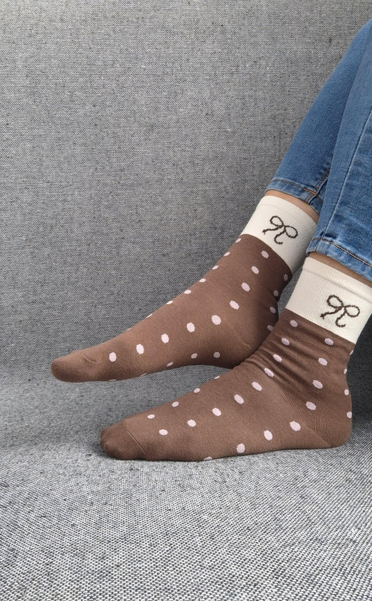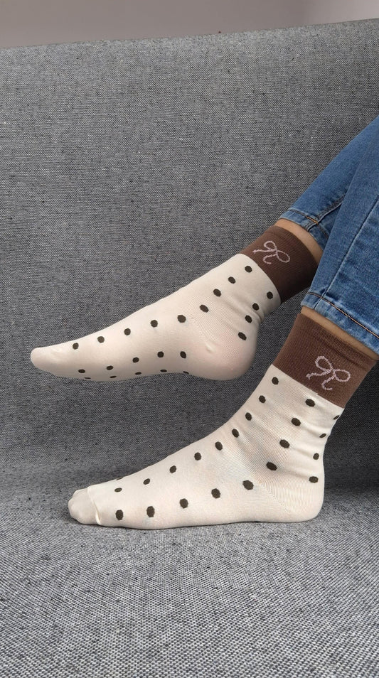 Paire de chaussettes beige en coton à pois noir avec bordure marron et motif nœud blanc