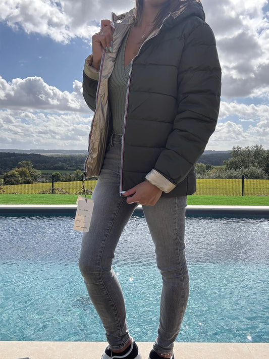 Doudoune manteau imperméable court réversible matelassé kaki doré