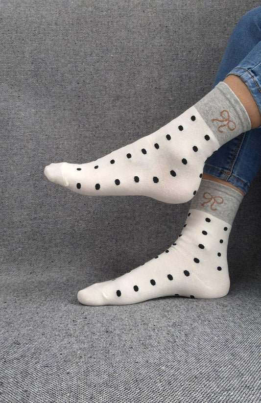 Paire de chaussettes beige en coton à pois noir avec bordure grise et motif nœud marron