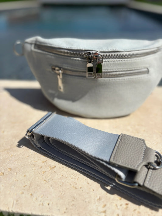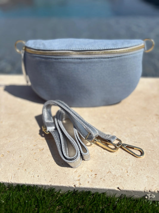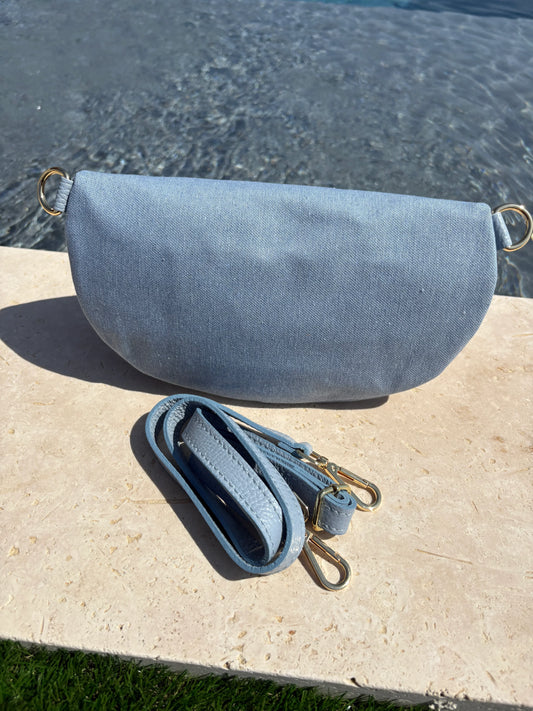 Sac banane tissu jean bandouliere bleu clair en cuir
