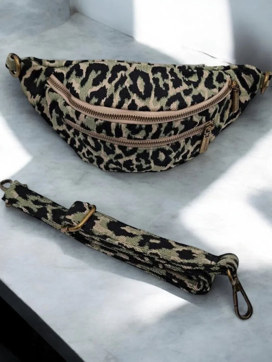 Sac banane en tissu à motif léopard vert 2 poches