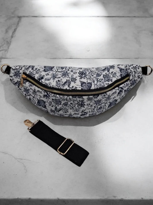 Sac banane blanc matelassé en coton motif floral noir