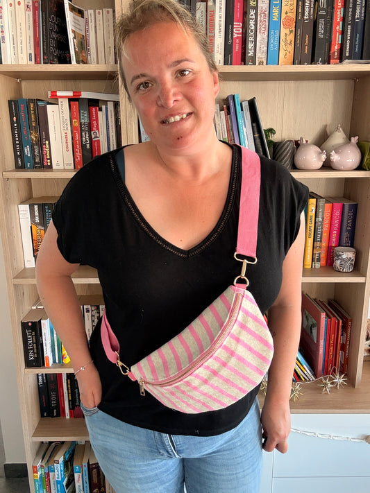 Sac Banane Tissu Rayé Rose & Blanc – Fermeture Dorée & Bandoulière Réglable