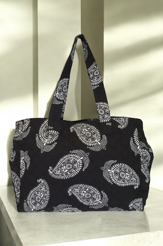 Sac week-end de voyage polochon noir coton design imprimé avec un motif paisley blanc