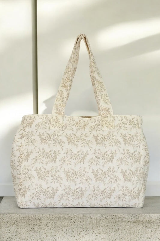 Sac week-end de voyage polochon écru coton design imprimé avec un motif floral taupe