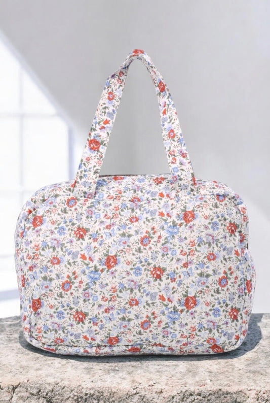 Sac polochon week-end motif liberty floral multicolore avec des motifs rose, violet et bleu