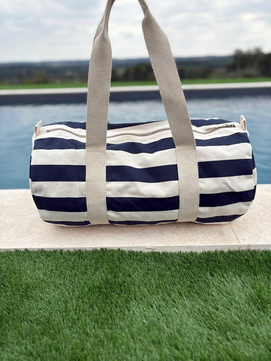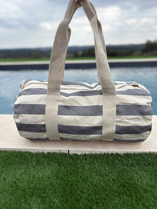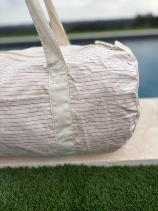 Sac polochon week end de voyage en coton léger rayé beige rouge rose
