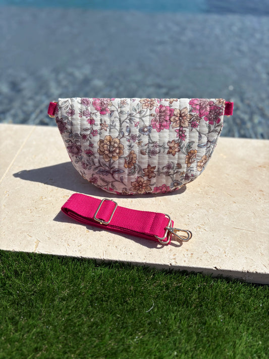 Sac banane en coton matelassé liberty blanc motif floral rose fuschia