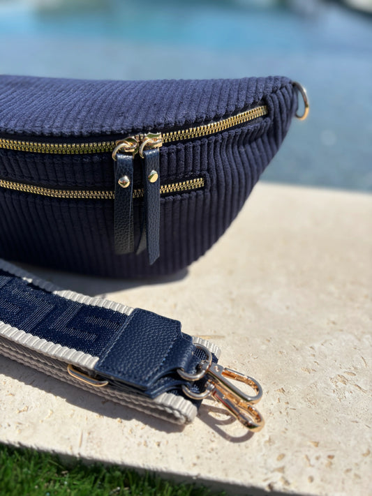 Sac banane velours côtelé 2 poches bleu marine sangle fantaisie