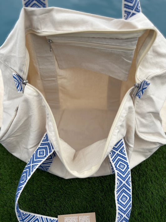 Sac polochon en coton tissu beige avec poignées motifs géométriques en bleu et blanc