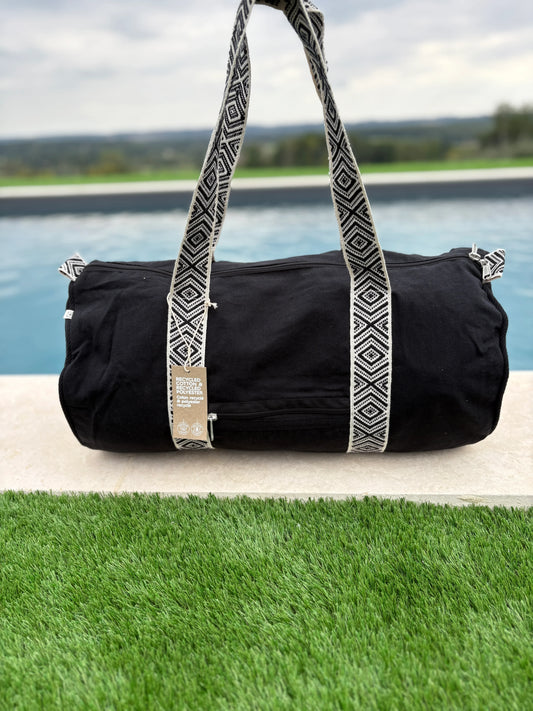 Sac polochon en coton tissu noir avec poignées motifs géométriques en noir et blanc