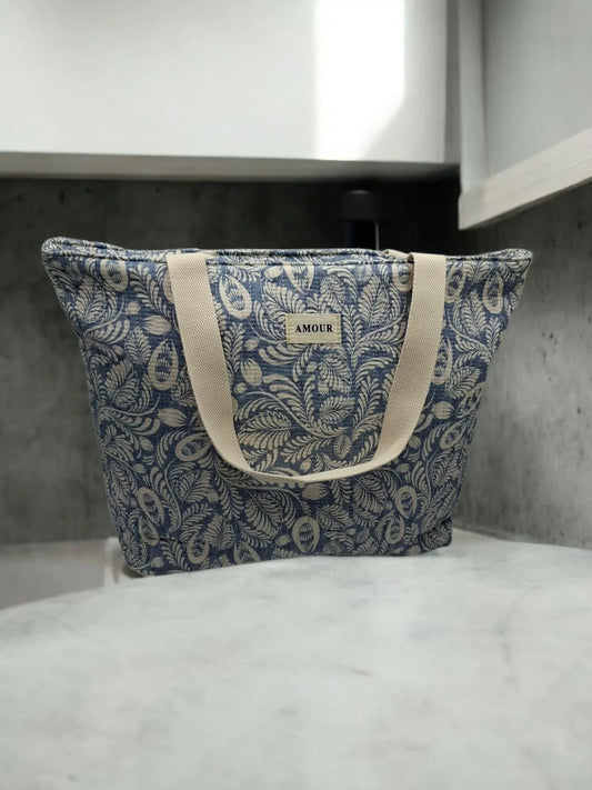 Sac cabas porté épaule coton imprimé toile de jouy feuilles bleues creme