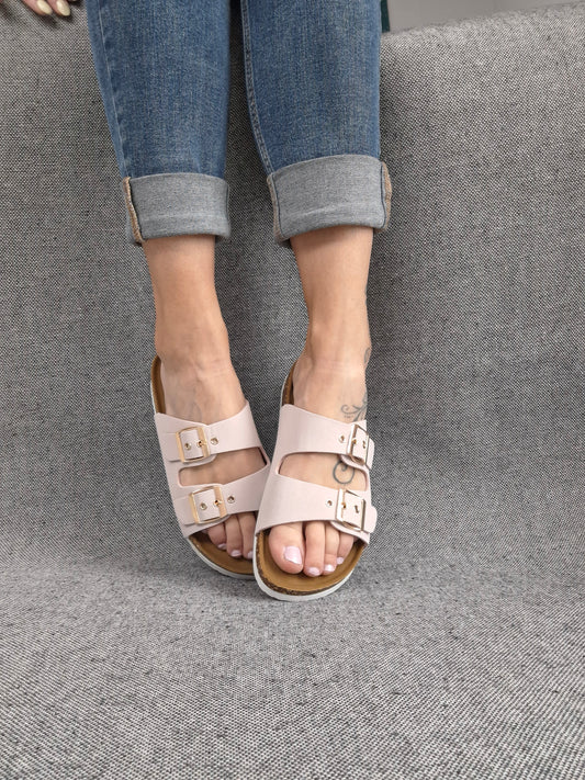 Chaussures sandales roses pastel à doubles lanières avec boucles métalliques style Birk