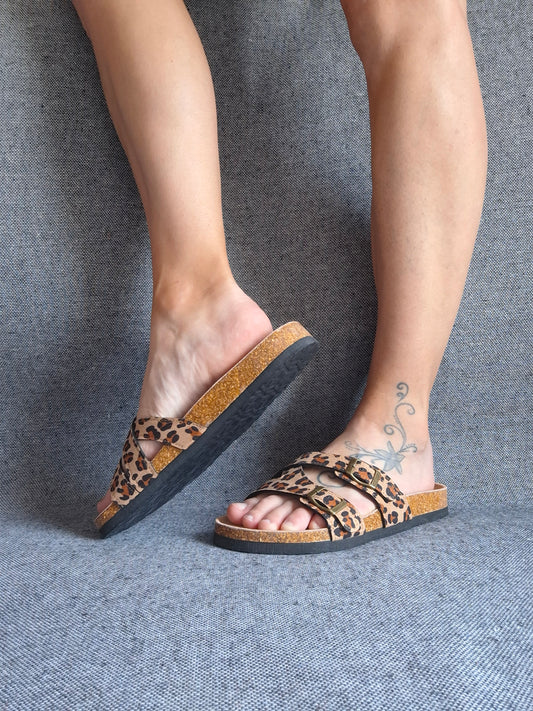 Chaussures sandales type Birk à 2 brides léopard beige semelle intérieure cuir