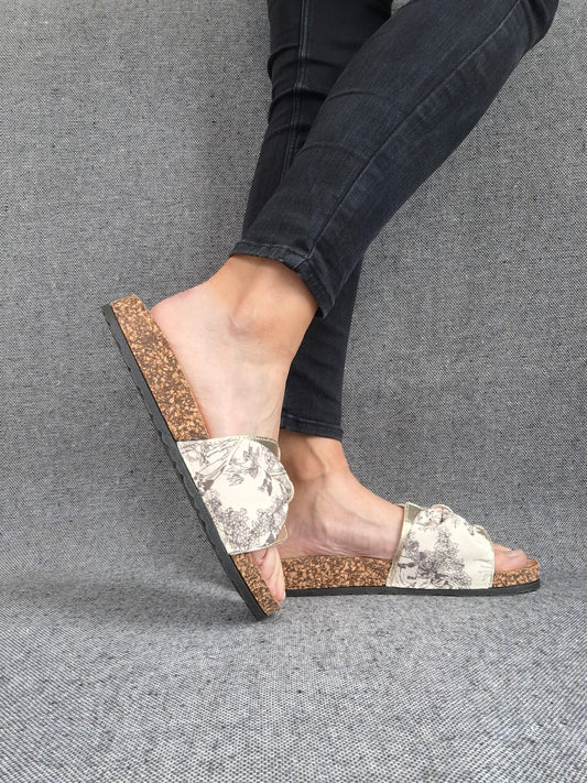 Chaussures sandales type birk 1 bride tissu toile de jouy beige noir