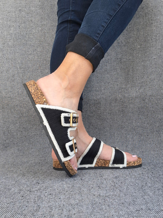 Chaussures sandales type birk 2 brides tissu bicolore noir et beige
