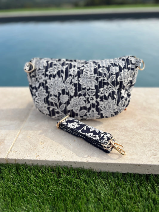 Riñonera de algodón acolchado estampado liberty floral toile de jouy azul marino y blanco