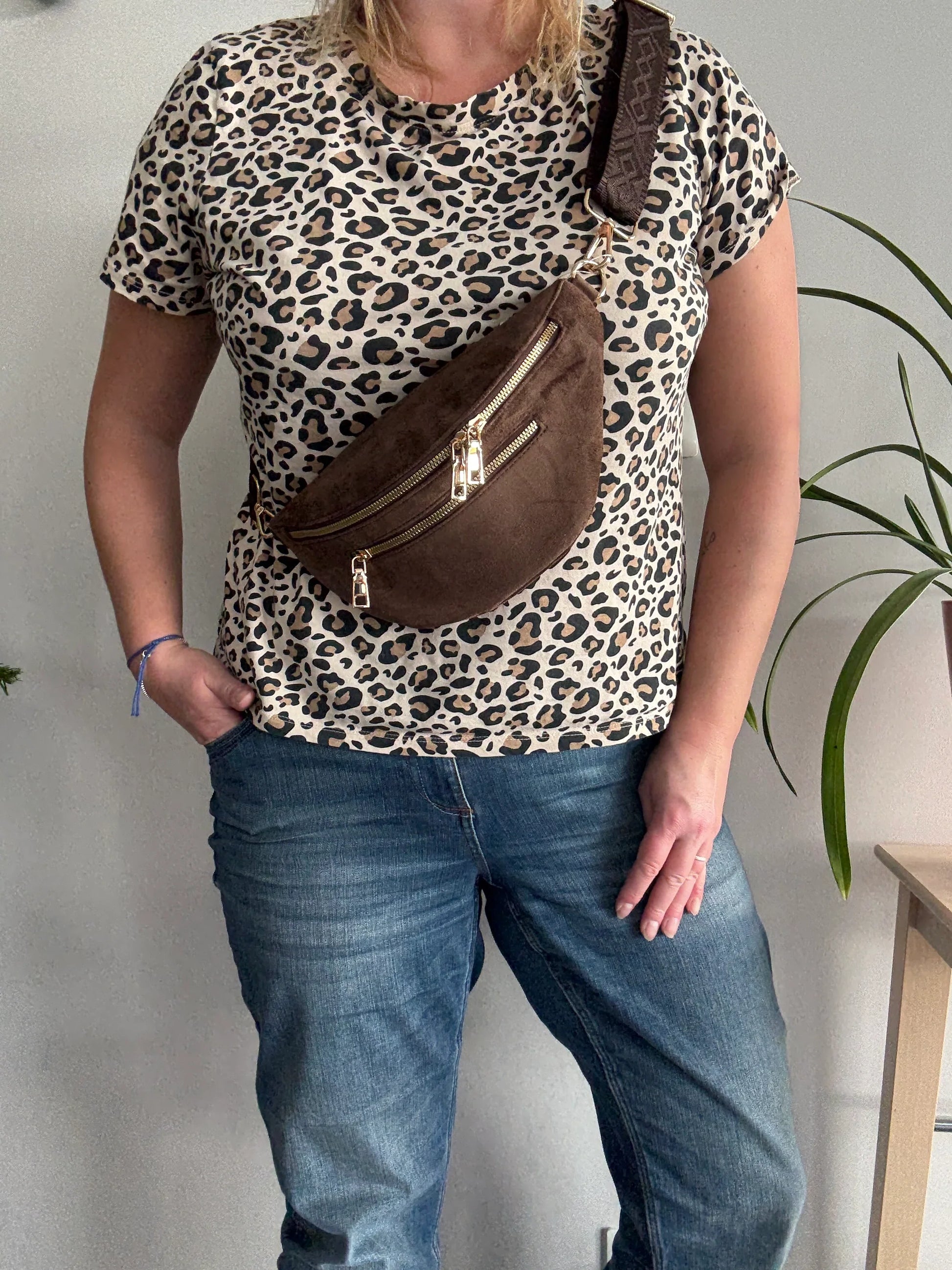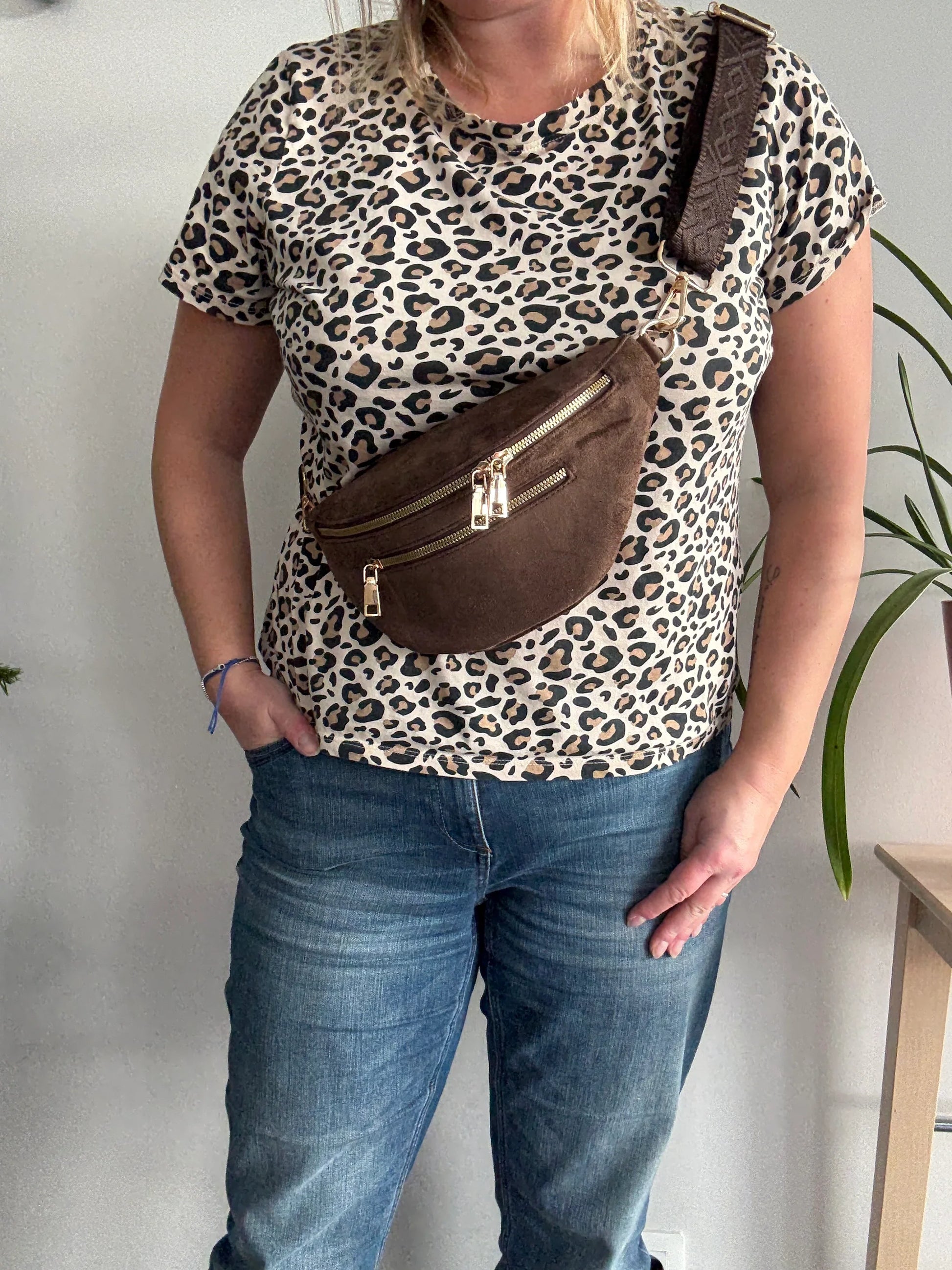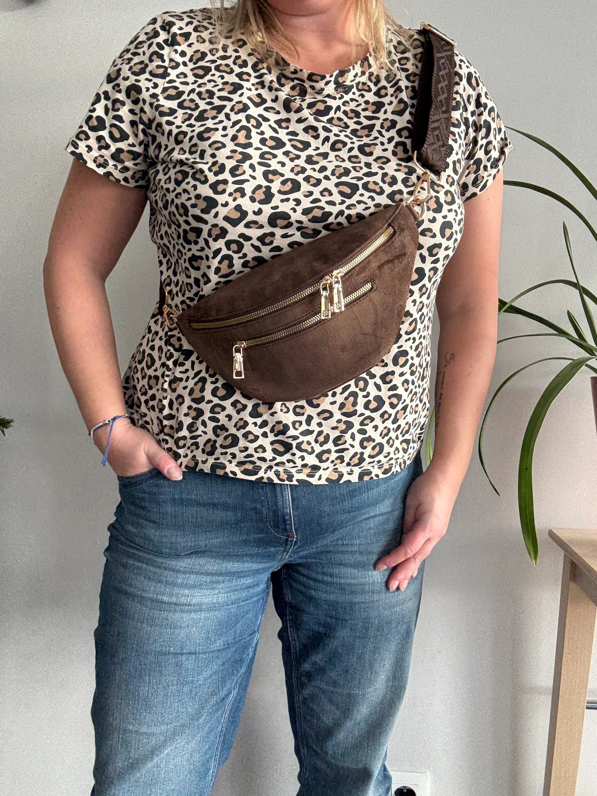 Riñonera efecto ante 2 bolsillos correa estampada color Marrón chocolate