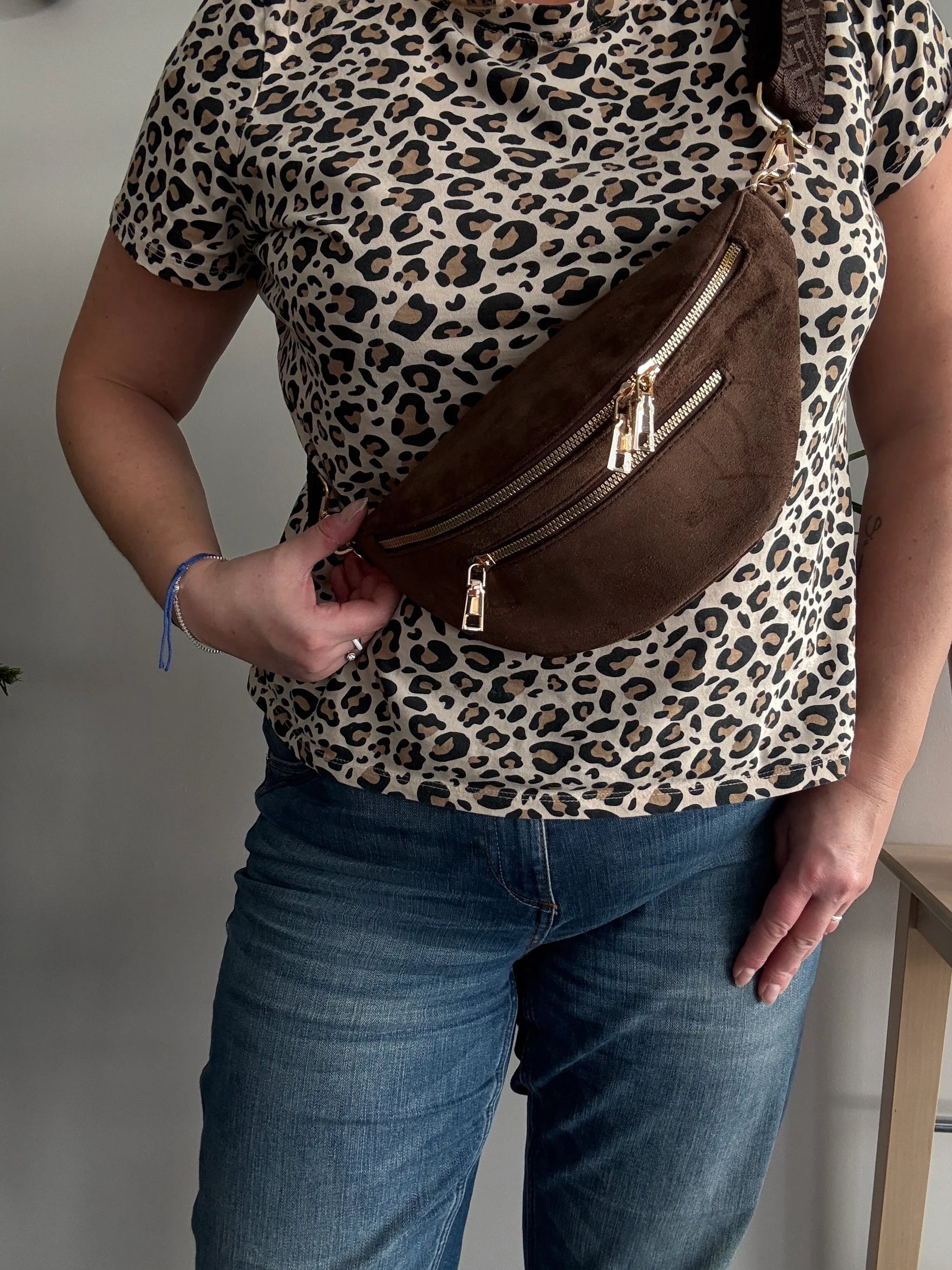 La riñonera es de color marrón chocolate con una textura que simula ante.