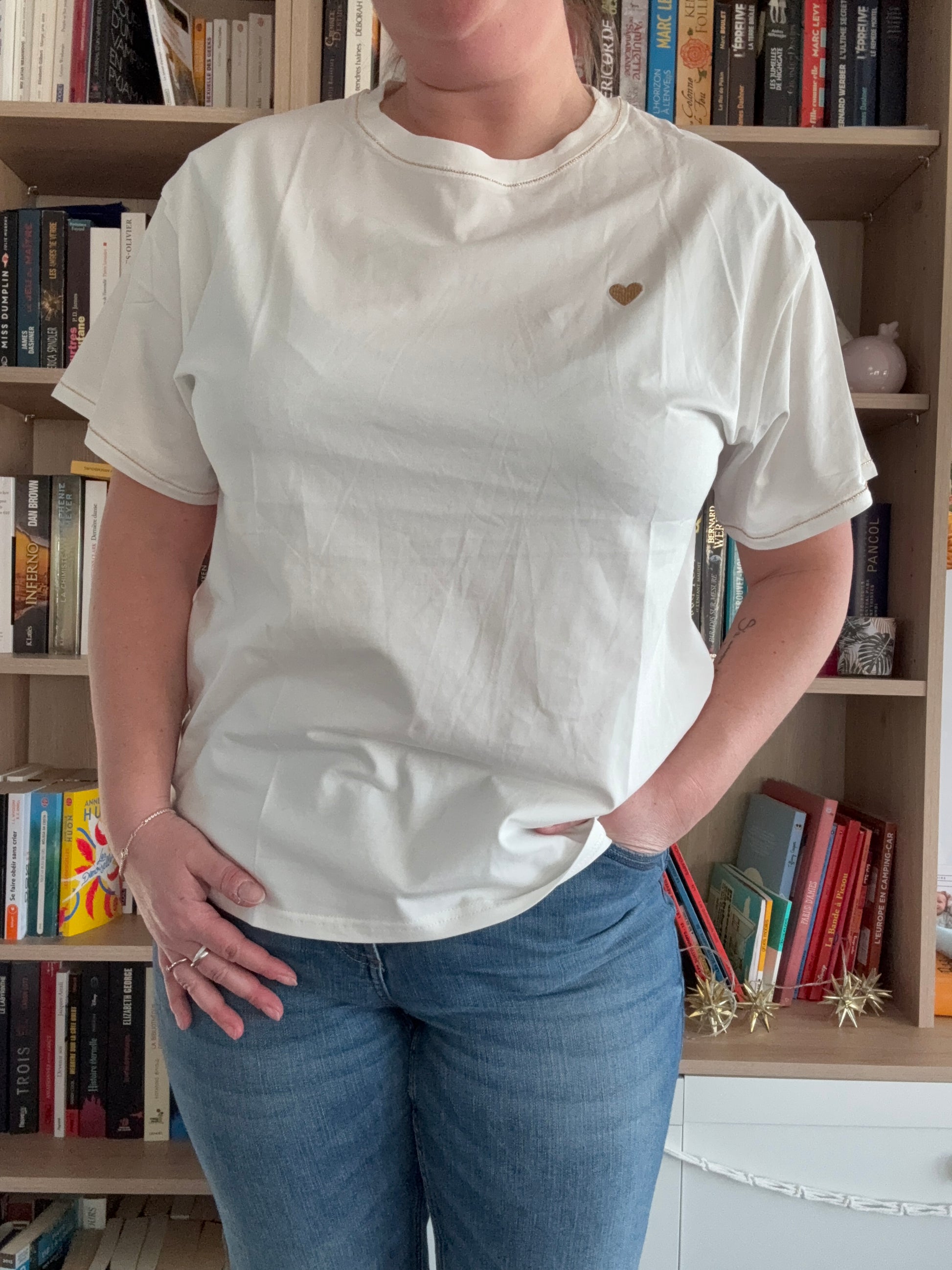 Esta camiseta blanca inmaculada, adornada con un delicado motivo de corazón dorado, es la pieza luminosa que su armario estaba esperando. Suave al tacto, se viste o se relaja según su estado de ánimo, desde un brunch soleado hasta una velada improvisada.