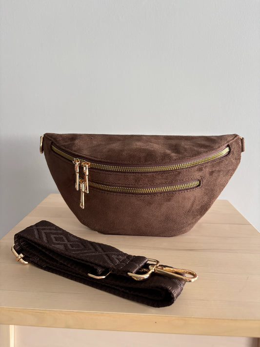 Riñonera de pana con 2 cremalleras de cuero marrón chocolate