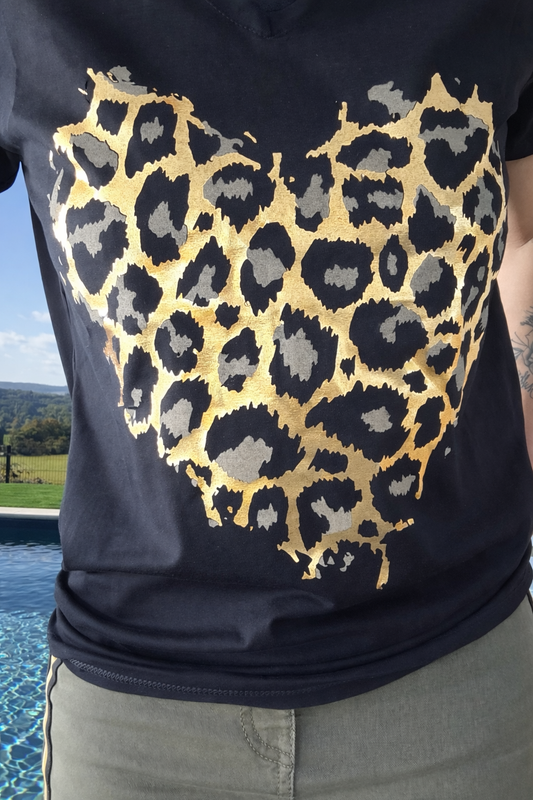 Camiseta negra de algodón con estampado de corazón de leopardo