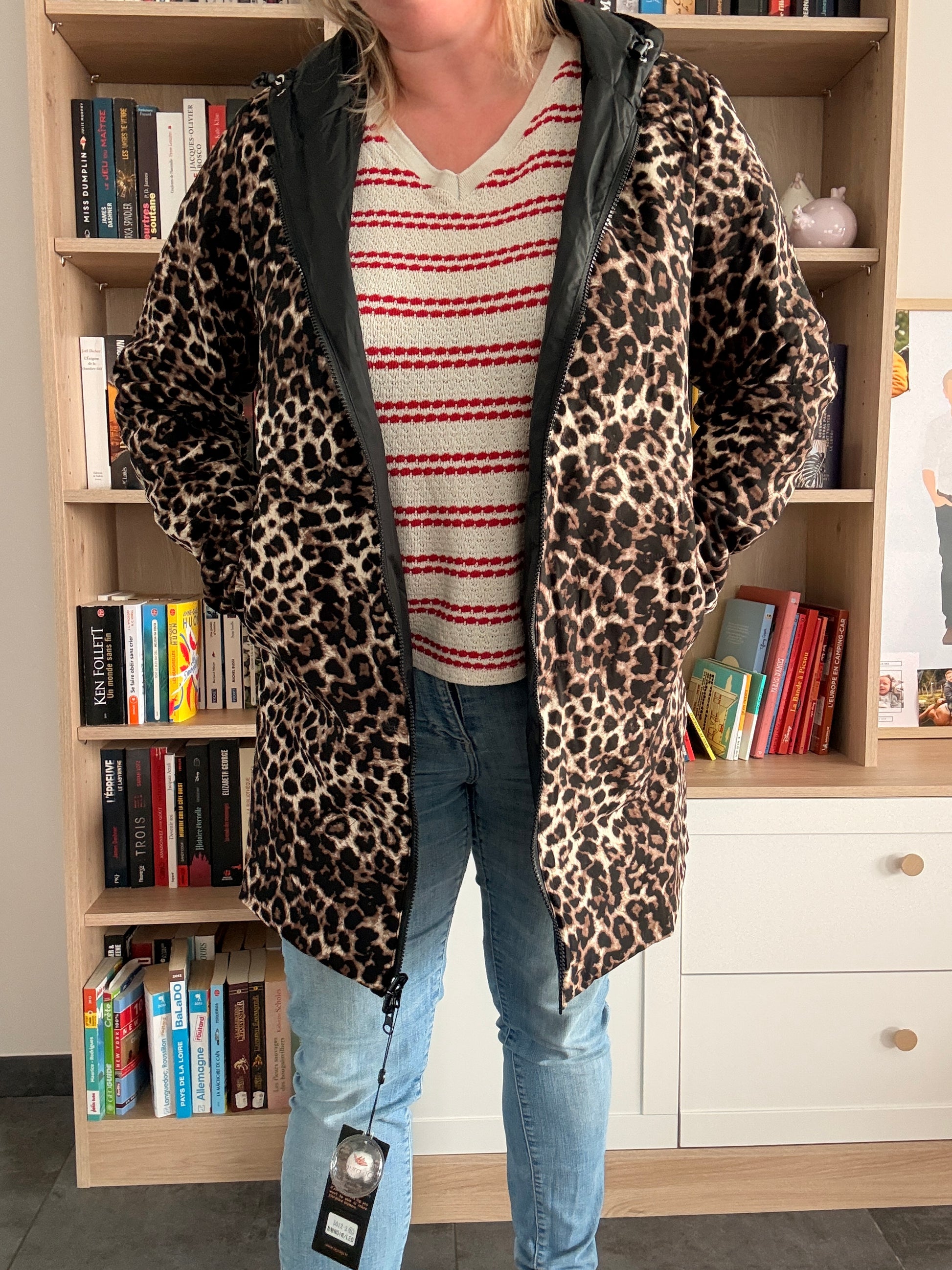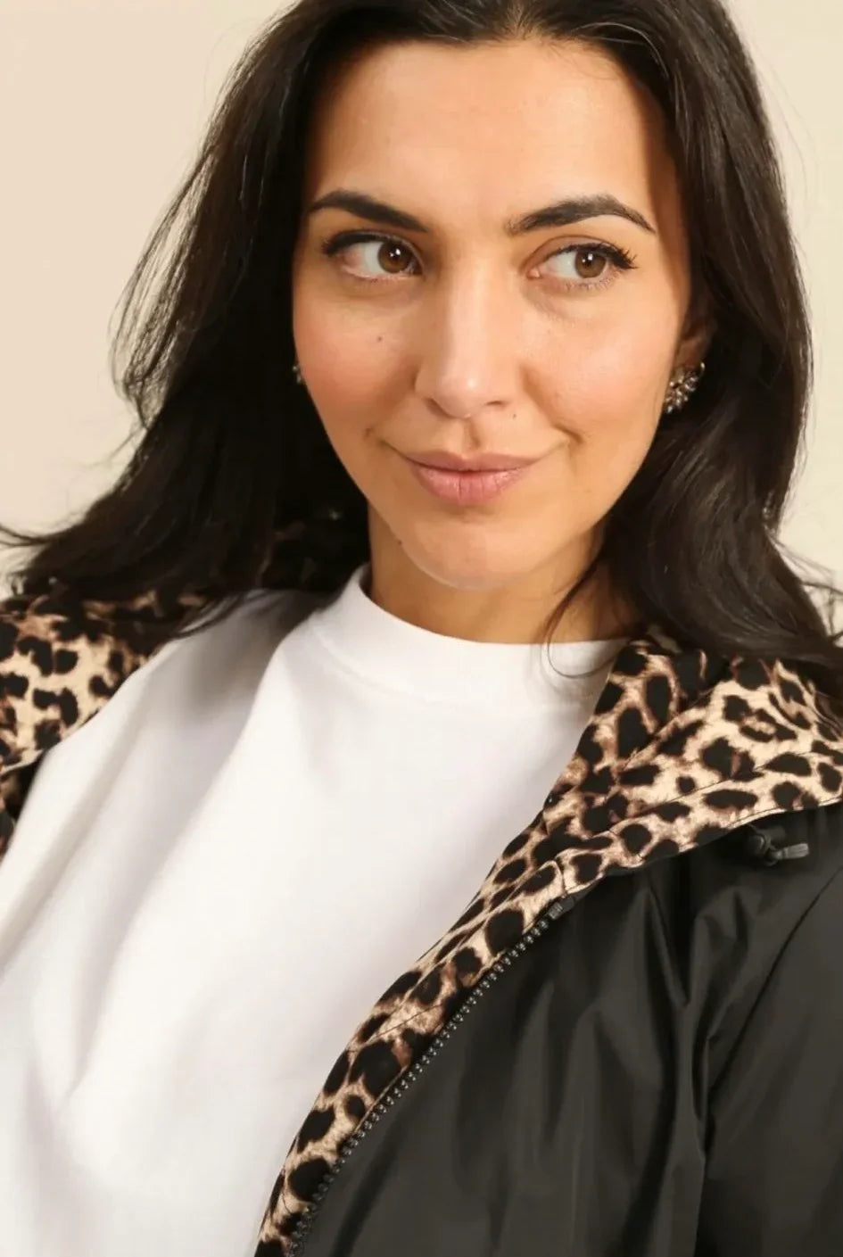 Parka Impermeable Reversible Larga de Mujer Laura Jo - Negra y Leopardo con Capucha