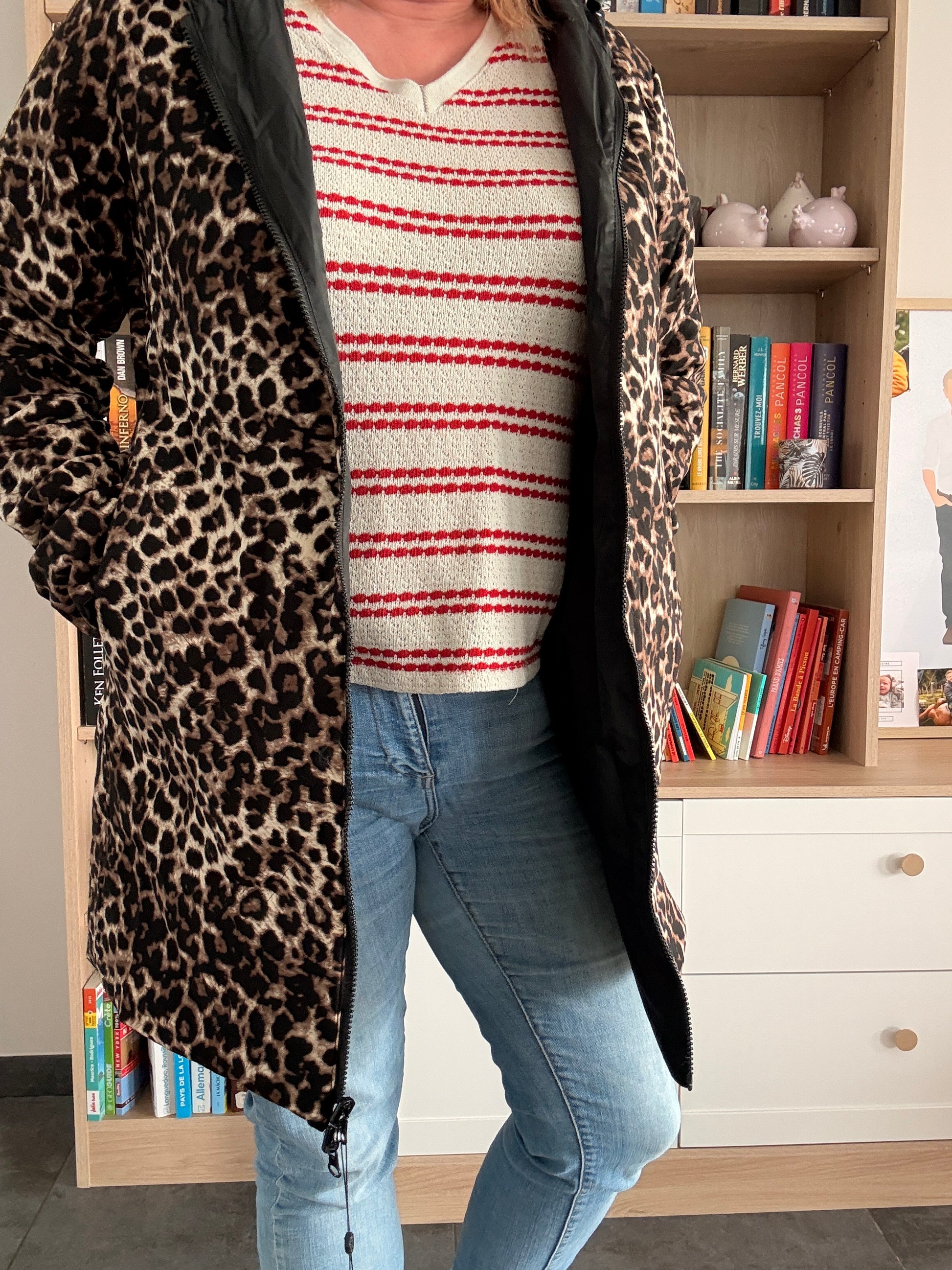 ¡Dos colores en un solo abrigo! Lleva el lado negro para un look elegante y clásico, o dale la vuelta para lucir el lado leopardo y un estilo más atrevido y de moda. Máxima versatilidad para tu armario.
