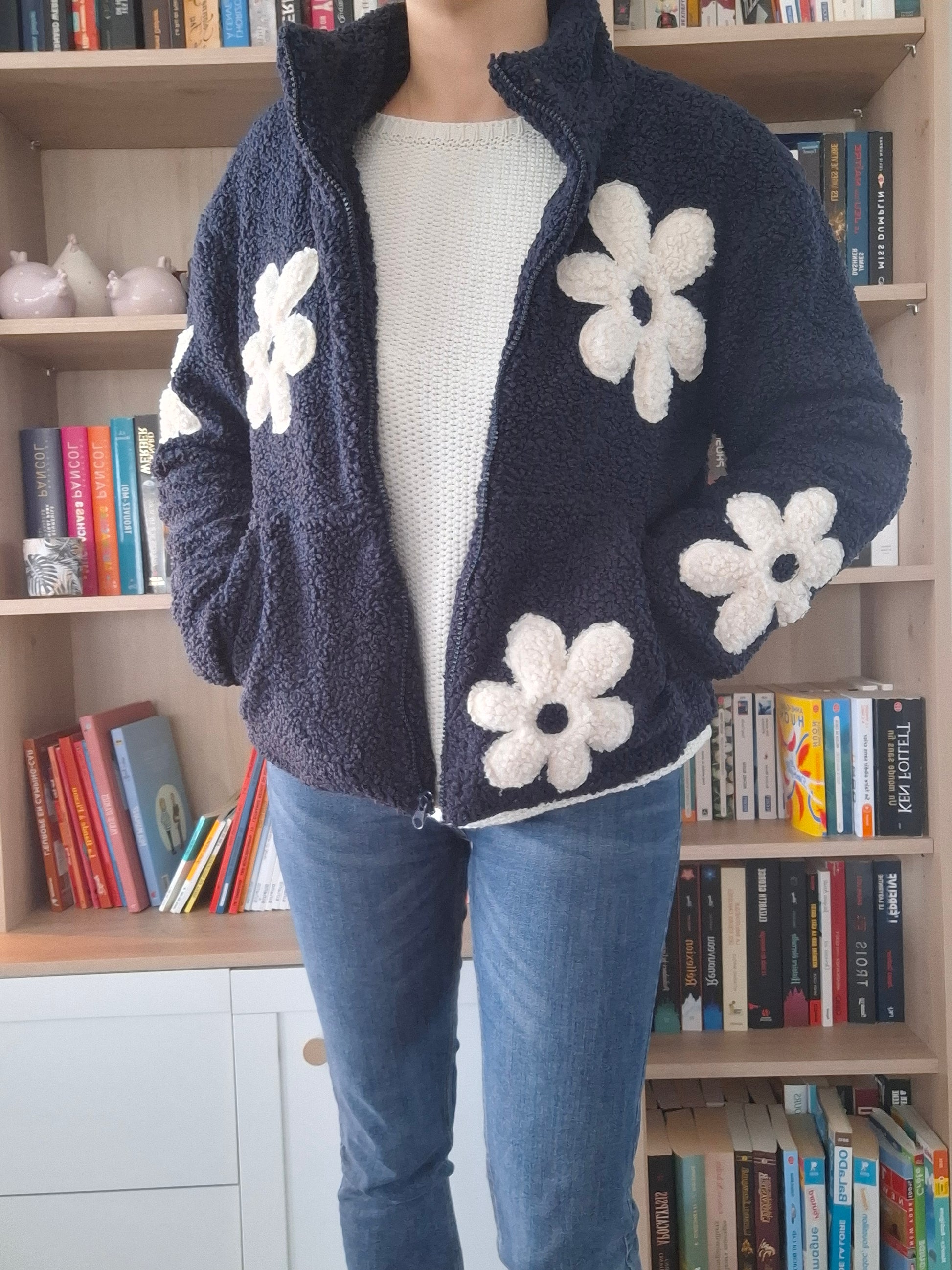 Ultrasuave y envolvente, esta chaqueta sherpa con estampado floral combina la comodidad de un polar con la elegancia de una prenda de moda. Su atemporal y versátil color azul marino combina fácilmente con todos tus atuendos, mientras que las flores blancas en relieve añaden una nota romántica y original.