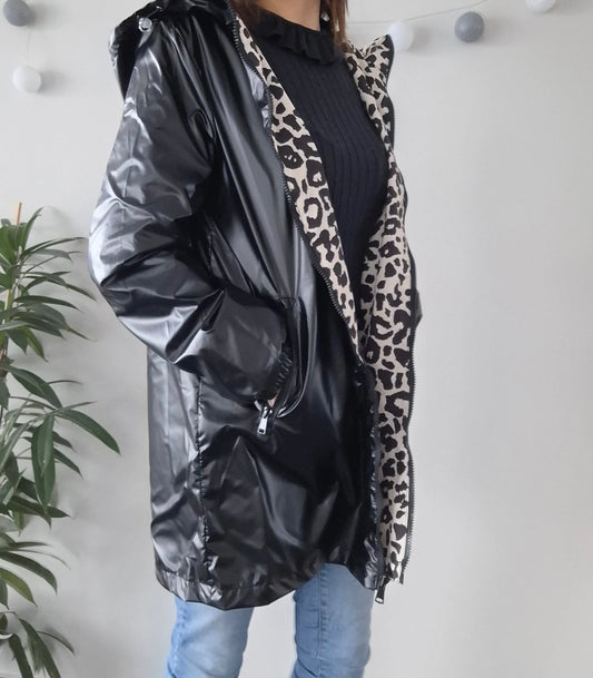 Attrait Paris - Manteau long sans ouate imperméable noir réversible avec motif léopard avec capuche