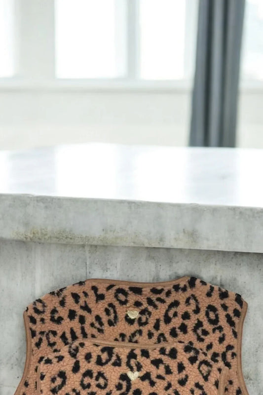 Veste gilet peluche moumoute sans manches imprimé léopard marron noir