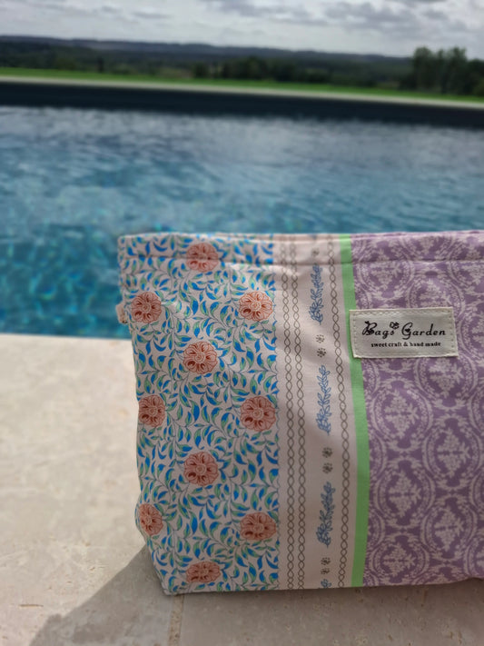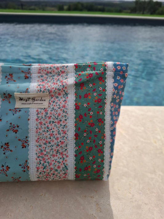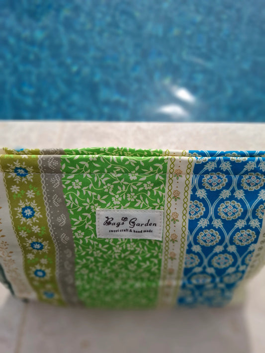 Trousse en tissu imperméabilisé motifs patchwork à rayures florales bleu rose et vert