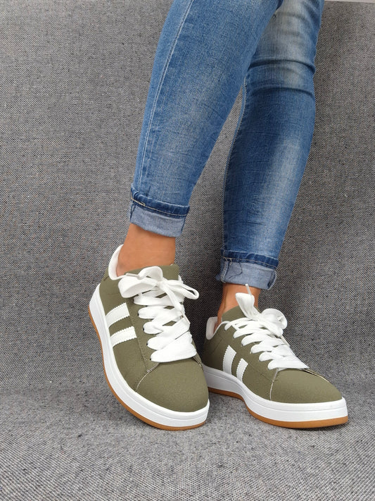 Chaussures baskets basses kaki vert olive à bandes blanches style campus