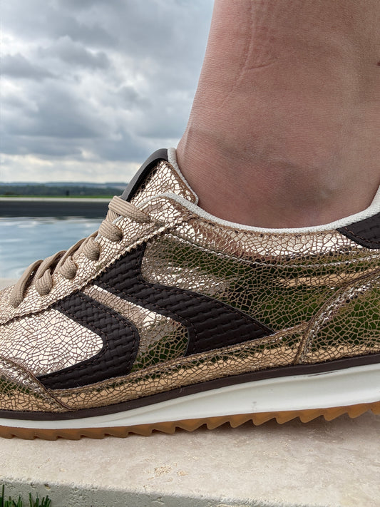 Chaussures baskets basses dorées en simili craquelé avec deux bandes marron chocolat