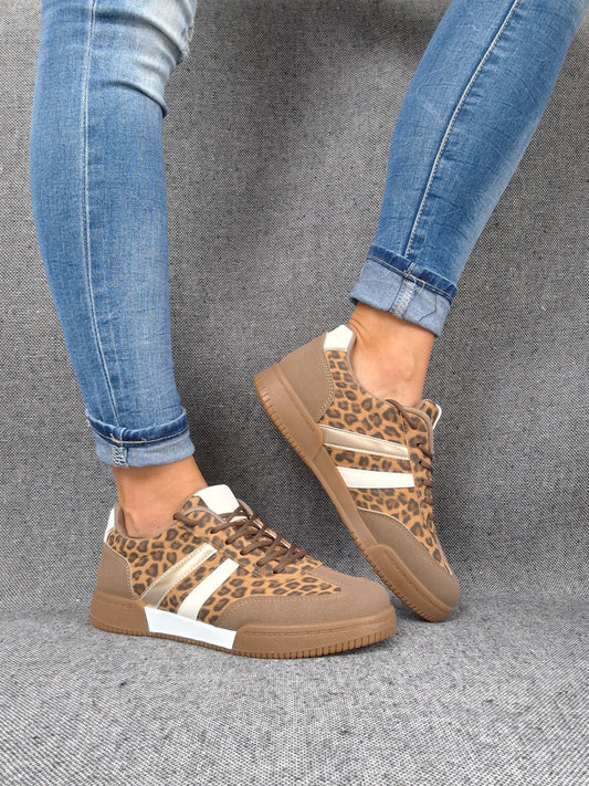 Chaussures baskets imprimé léopard avec bandes blanches et dorées type sneakers