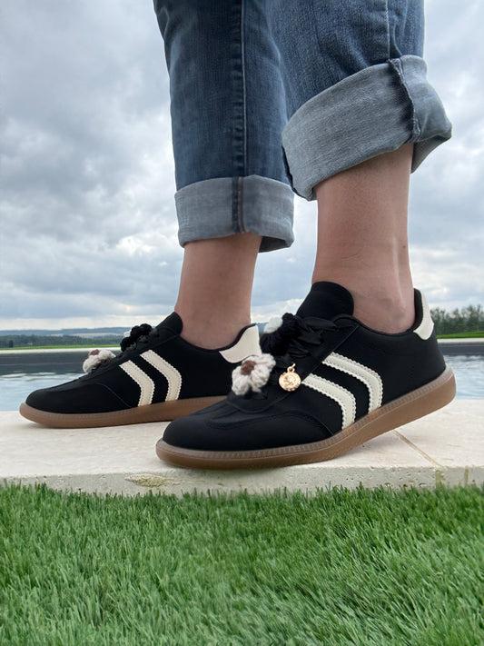 Chaussures baskets basses noires rayures noires motif léopard style campus