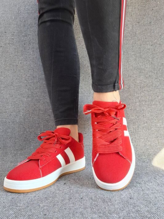 Chaussures baskets basses rouges avec bandes blanches style campus