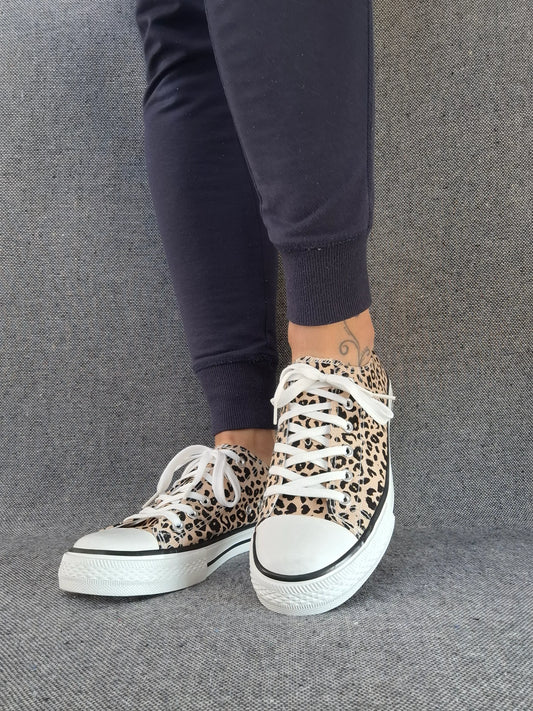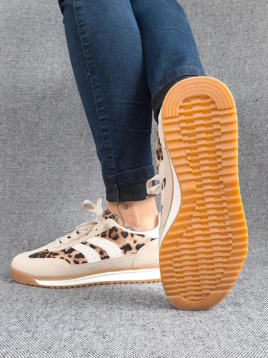 Chaussures baskets basses taupe léopard avec bandes blanches style sneakers