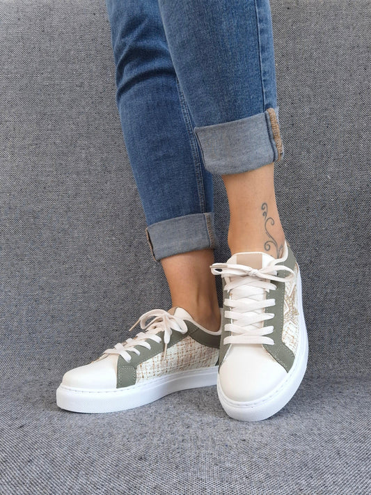 Chaussures baskets en tissu beige et kaki rehaussée par un motif taupe style sneakers