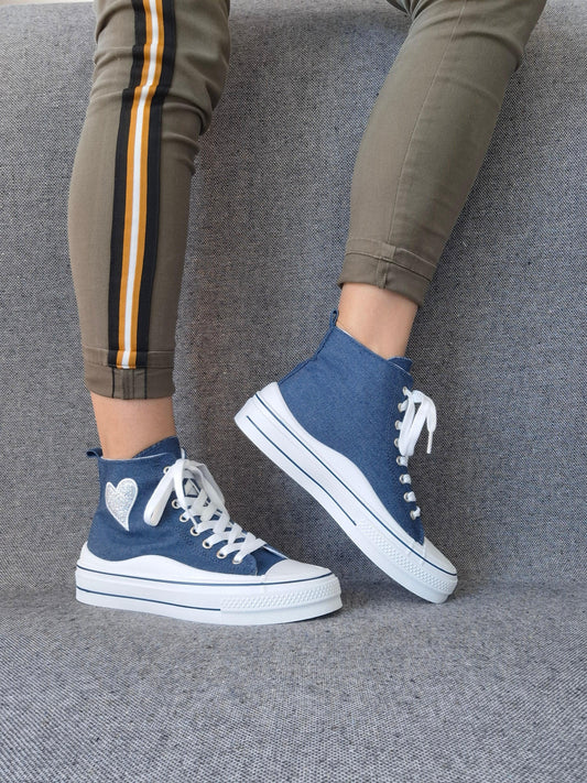 Chaussures baskets hautes bleu marine avec motif cœur argenté style converse